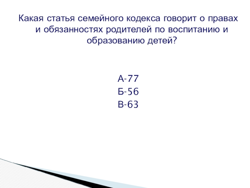 Слайд 42Какая статья семейного кодекса говорит о правах и обязанностях родителей по