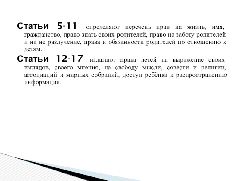 Статьи 5-11 определяют перечень прав на жизнь, имя, гражданство, право знать