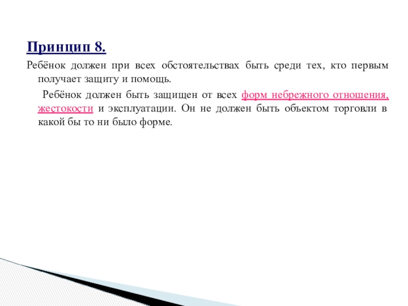 Ребёнок должен быть защищен от всех форм небрежного отношения, жестокости и эксплуатации. Он не должен быть объектом торговли в какой бы то ни было форме.