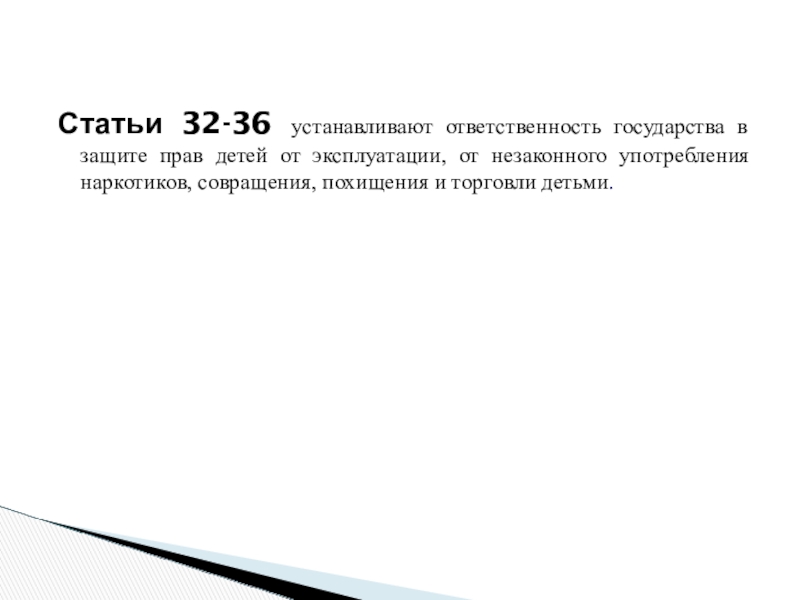 Статьи 32-36 устанавливают ответственность государства в защите прав детей от эксплуатации,
