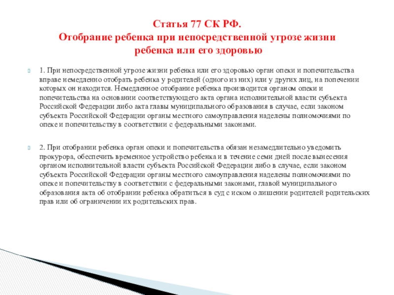Ст. 77 « Отобрание ребенка при непосредственной угрозе жизни ребенка или его здоровью».