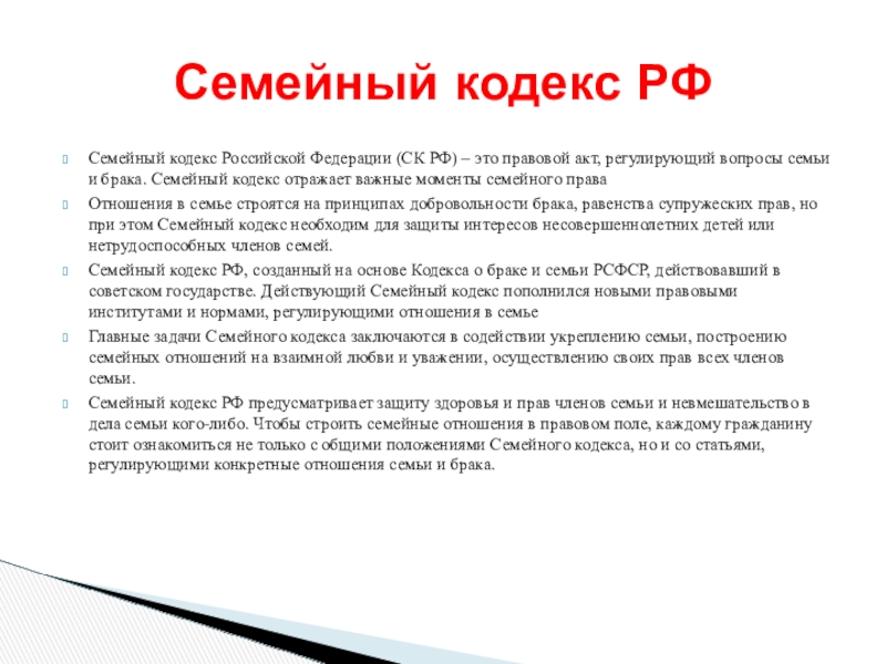 Слайд 27Семейный кодекс Российской Федерации (СК РФ) – это правовой акт, регулирующий