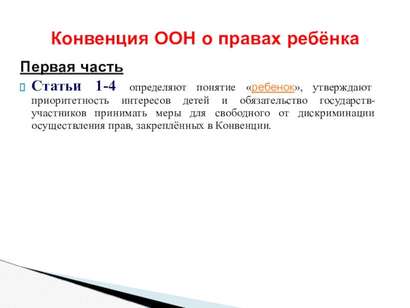 Статьи 1-4 определяют понятие «ребенок», утверждают приоритетность интересов детей