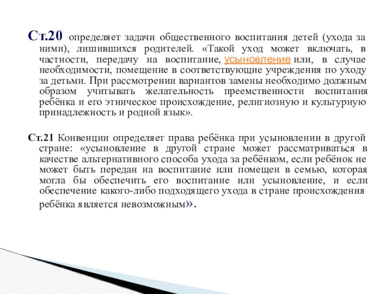 Ст.21 Конвенции определяет права ребёнка при усыновлении в другой стране: «усыновление в другой стране может рассматриваться в качестве альтернативного способа ухода за ребёнком, если ребёнок не может быть передан на воспитание или помещен в семью, которая могла бы обеспечить его воспитание или усыновление, и если обеспечение какого-либо подходящего ухода в стране происхождения ребёнка является невозможным».