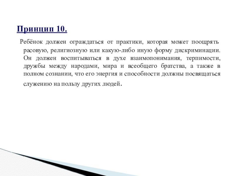 религиозную или какую-либо иную форму дискриминации. Он должен воспитываться в духе взаимопонимания, терпимости, дружбы между народами, мира и всеобщего братства, а также в полном сознании, что его энергия и способности должны посвящаться служению на пользу других людей.