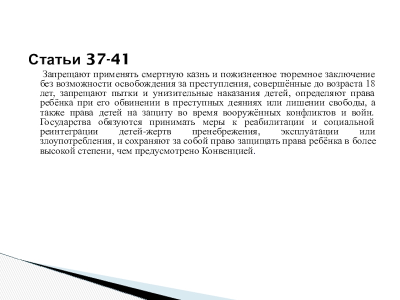 тюремное заключение без возможности освобождения за преступления, совершённые до возраста 18 лет, запрещают пытки и унизительные наказания детей, определяют права ребёнка при его обвинении в преступных деяниях или лишении свободы, а также права детей на защиту во время вооружённых конфликтов и войн. Государства обязуются принимать меры к реабилитации и социальной реинтеграции детей-жертв пренебрежения, эксплуатации или злоупотребления, и сохраняют за собой право защищать права ребёнка в более высокой степени, чем предусмотрено Конвенцией.