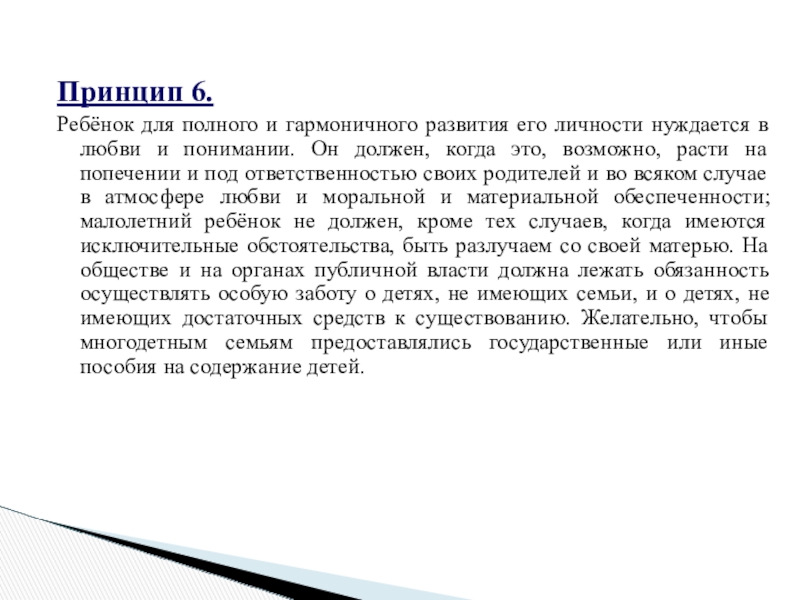 в любви и понимании. Он должен, когда это, возможно, расти на попечении и под ответственностью своих родителей и во всяком случае в атмосфере любви и моральной и материальной обеспеченности; малолетний ребёнок не должен, кроме тех случаев, когда имеются исключительные обстоятельства, быть разлучаем со своей матерью. На обществе и на органах публичной власти должна лежать обязанность осуществлять особую заботу о детях, не имеющих семьи, и о детях, не имеющих достаточных средств к существованию. Желательно, чтобы многодетным семьям предоставлялись государственные или иные пособия на содержание детей.