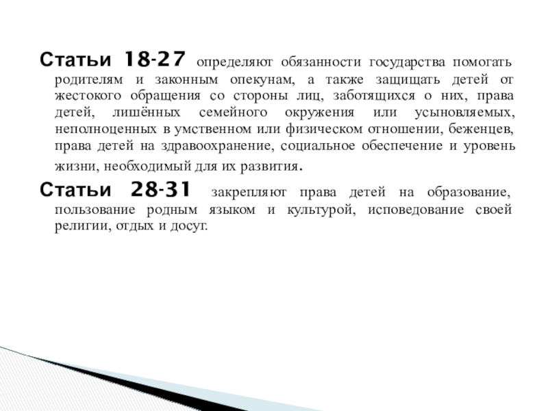 Статьи 28-31 закрепляют права детей на образование, пользование родным языком и культурой, исповедование своей религии, отдых и досуг.