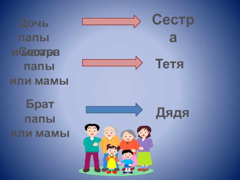 Дочь папы и мамыСестраСестра папы или мамыТетяБрат папы или мамыДядя