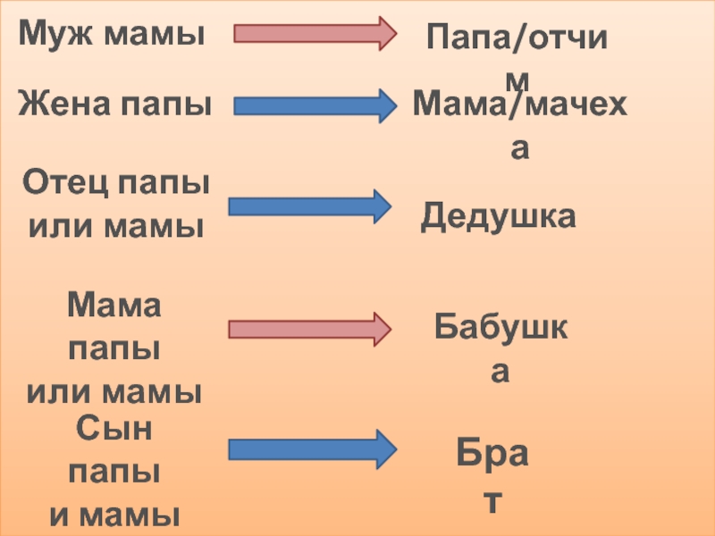 Муж мамыПапа/отчимЖена папыМама/мачехаОтец папы  или мамыДедушкаМама папыили мамыБабушкаСын папыи мамыБрат