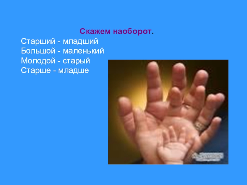 Скажем наоборот.Старший - младшийБольшой - маленькийМолодой - старыйСтарше - младше