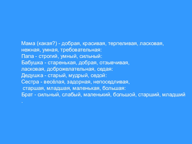 Мама (какая?) - добрая, красивая, терпеливая, ласковая, нежная, умная, требовательная:Папа - строгий, умный, сильный:Бабушка - старенькая, добрая,