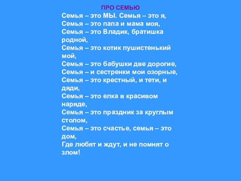 ПРО СЕМЬЮСемья – это МЫ. Семья – это я,Семья – это папа и мама моя,Семья – это