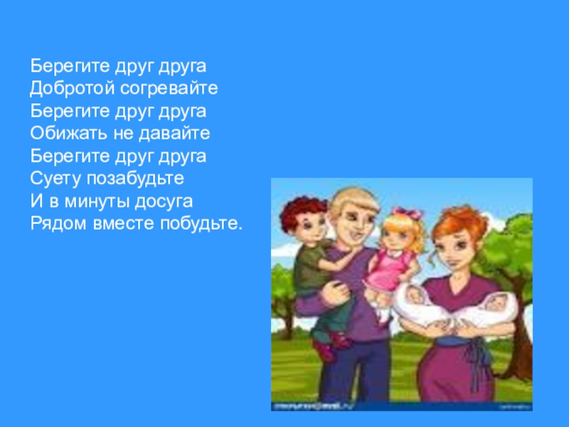 Берегите друг другаДобротой согревайтеБерегите друг другаОбижать не давайтеБерегите друг другаСуету позабудьтеИ в минуты досугаРядом вместе побудьте.