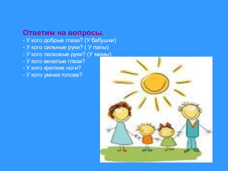 Ответим на вопросы.- У кого добрые глаза? (У бабушки)- У кого сильные руки? ( У папы)- У