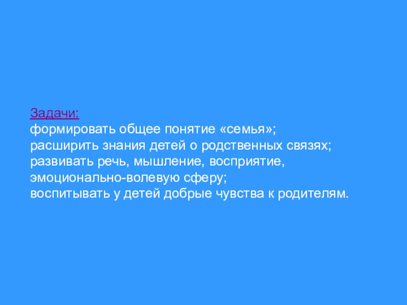 Задачи: формировать общее понятие «семья»; расширить знания детей о родственных связях; развивать речь, мышление, восприятие, эмоционально-волевую сферу; воспитывать у детей добрые чувства к родителям.