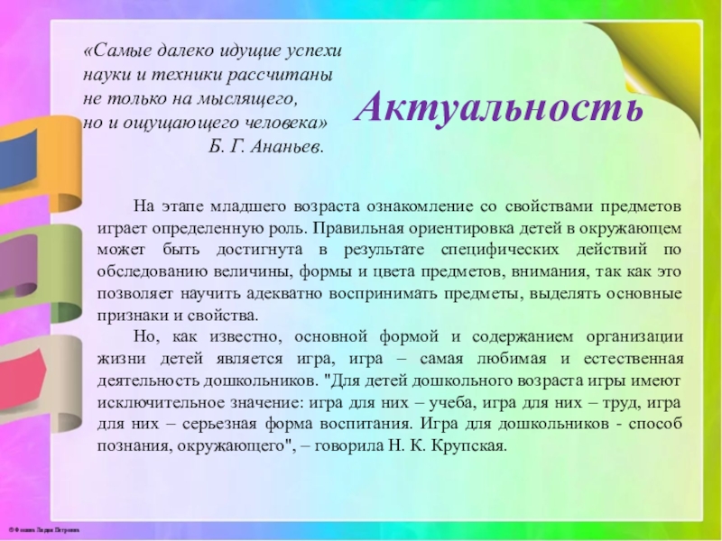 На этапе младшего возраста ознакомление со свойствами предметов играет определенную роль. Правильная ориентировка детей в окружающем может быть достигнута в результате специфических действий по обследованию величины, формы и цвета предметов, внимания, так как это позволяет научить адекватно воспринимать предметы, выделять основные признаки и свойства.