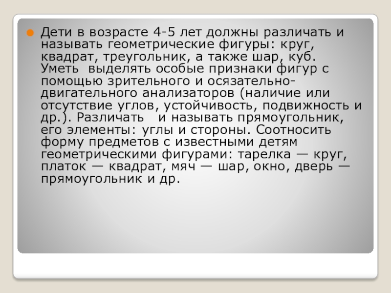 круг, квадрат, треугольник, а также шар, куб. Уметь выделять особые признаки фигур с помощью зрительного и осязательно-двигательного анализаторов (наличие или отсутствие углов, устойчивость, подвижность и др.). Различать и называть прямоугольник, его элементы: углы и стороны. Соотносить форму предметов с известными детям геометрическими фигурами: тарелка — круг, платок — квадрат, мяч — шар, окно, дверь — прямоугольник и др.