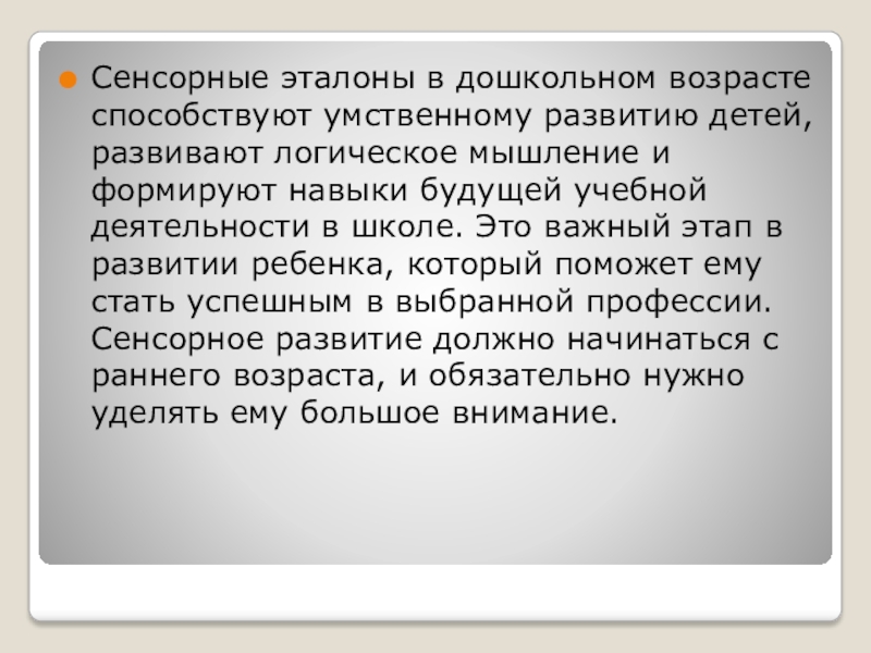 Слайд 6Сенсорные эталоны в дошкольном возрасте способствуют умственному развитию детей, развивают логическое