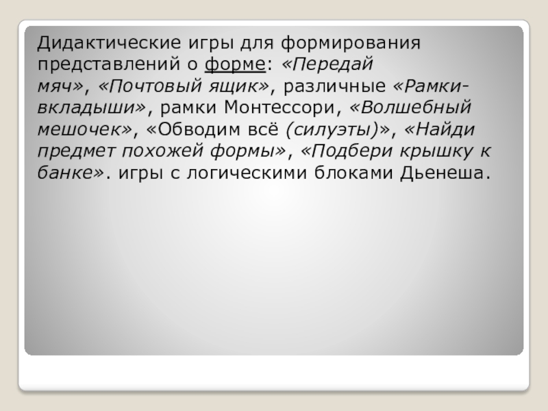 Слайд 7Дидактические игры для формирования представлений о форме: «Передай мяч», «Почтовый ящик», различные «Рамки-вкладыши», рамки Монтессори, «Волшебный