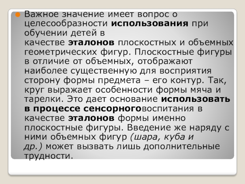 Слайд 5Важное значение имеет вопрос о целесообразности использования при обучении детей в качестве эталонов плоскостных и