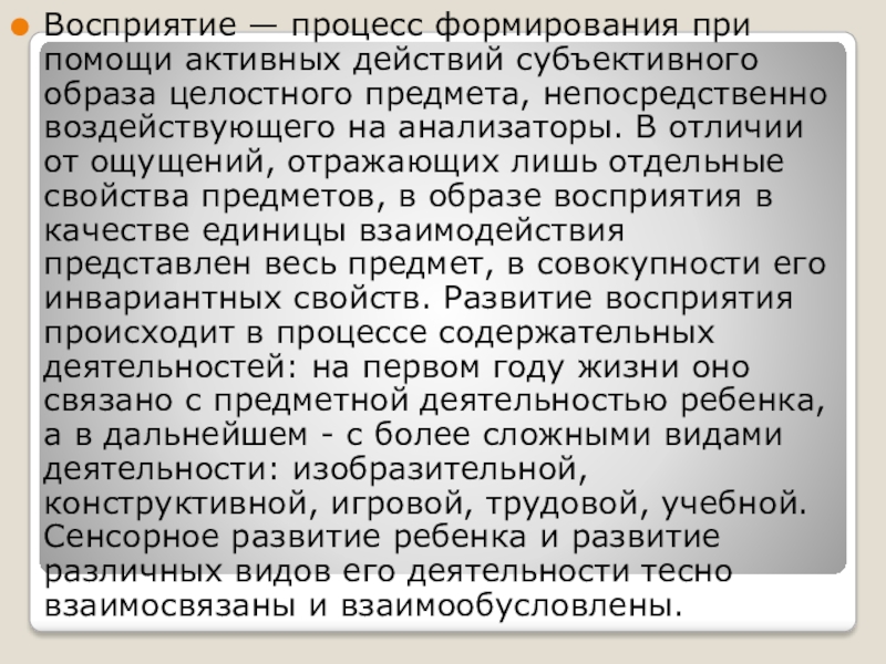 предмета, непосредственно воздействующего на анализаторы. В отличии от ощущений, отражающих лишь отдельные свойства предметов, в образе восприятия в качестве единицы взаимодействия представлен весь предмет, в совокупности его инвариантных свойств. Развитие восприятия происходит в процессе содержательных деятельностей: на первом году жизни оно связано с предметной деятельностью ребенка, а в дальнейшем - с более сложными видами деятельности: изобразительной, конструктивной, игровой, трудовой, учебной. Сенсорное развитие ребенка и развитие различных видов его деятельности тесно взаимосвязаны и взаимообусловлены.