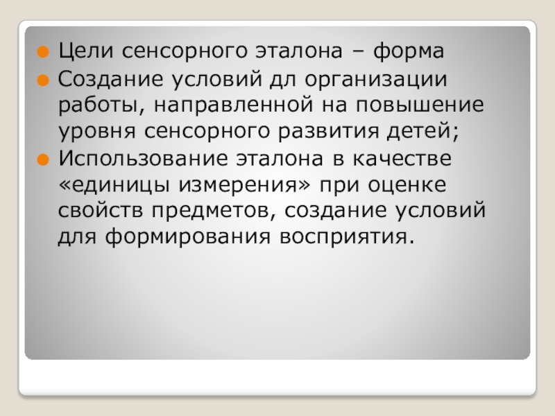 Использование эталона в качестве «единицы измерения» при оценке свойств предметов, создание условий для формирования восприятия.