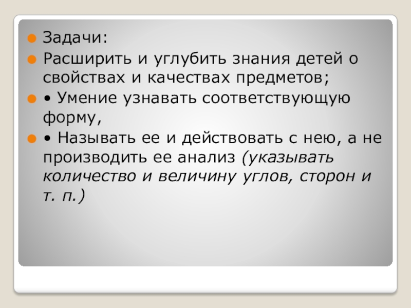 • Называть ее и действовать с нею, а не производить ее анализ (указывать количество и величину углов, сторон и т. п.)