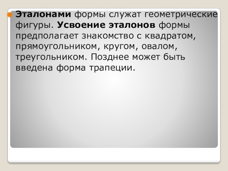 Слайд 2Эталонами формы служат геометрические фигуры. Усвоение эталонов формы предполагает знакомство с квадратом, прямоугольником, кругом,