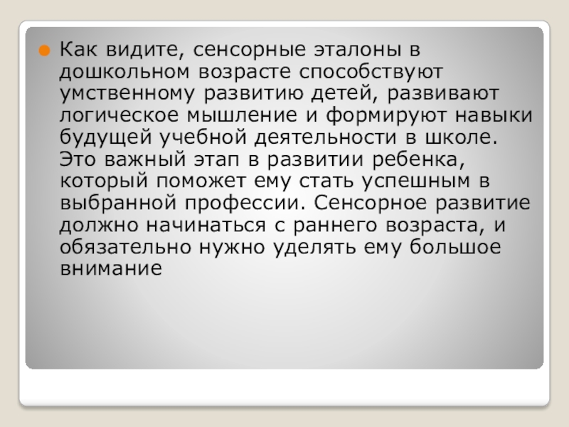 Слайд 12Как видите, сенсорные эталоны в дошкольном возрасте способствуют умственному развитию детей,