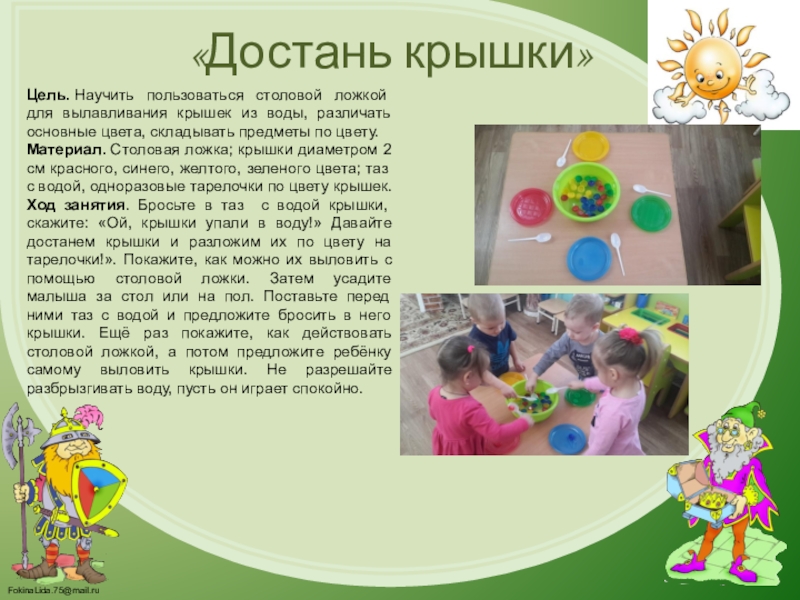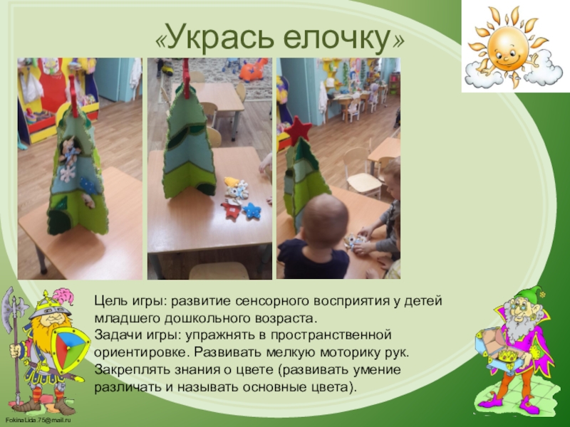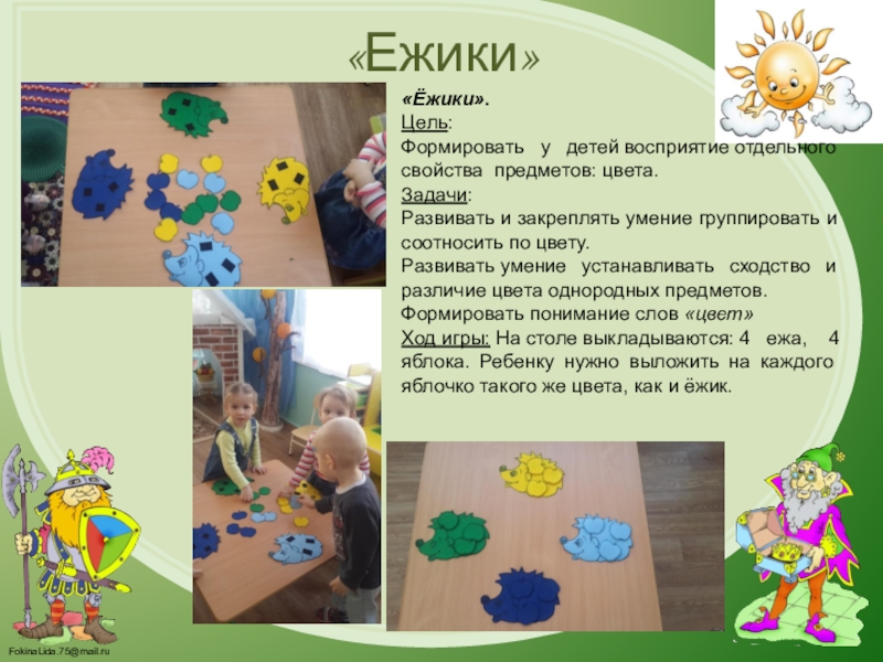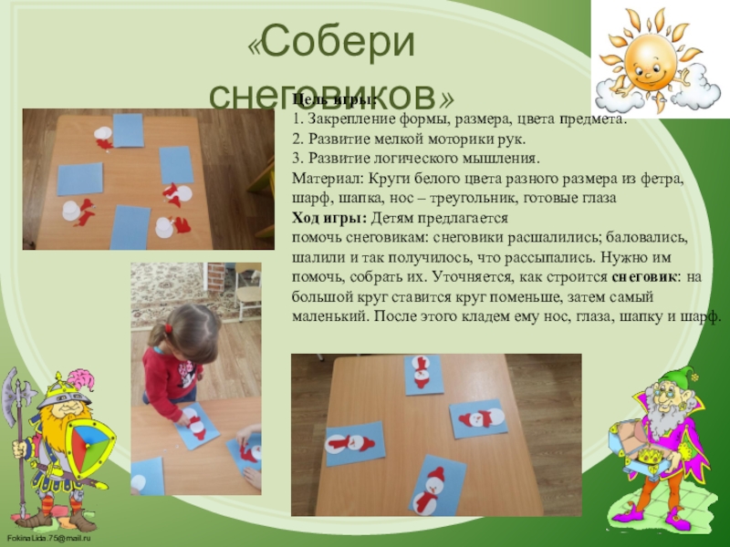 Ход игры: Детям предлагается помочь снеговикам: снеговики расшалились; баловались, шалили и так получилось, что рассыпались. Нужно им помочь, собрать их. Уточняется, как строится снеговик: на большой круг ставится круг поменьше, затем самый маленький. После этого кладем ему нос, глаза, шапку и шарф.