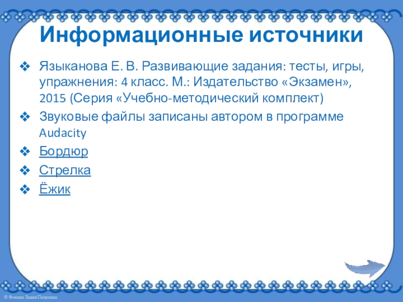 Информационные источникиЯзыканова Е. В. Развивающие задания: тесты, игры, упражнения: 4 класс. М.: Издательство «Экзамен», 2015 (Серия «Учебно-методический