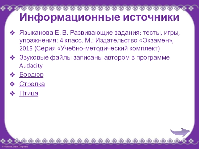 Информационные источникиЯзыканова Е. В. Развивающие задания: тесты, игры, упражнения: 4 класс. М.: Издательство «Экзамен», 2015 (Серия «Учебно-методический
