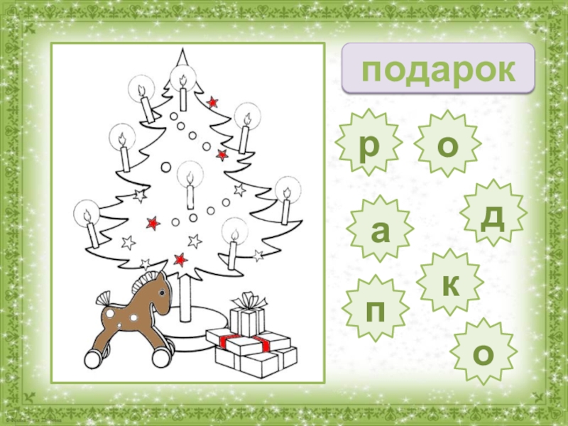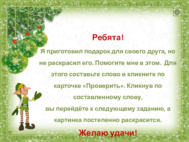 Ребята!Я приготовил подарок для своего друга, но не раскрасил его. Помогите мне в этом. Для этого составьте слово и кликните по карточке «Проверить». Кликнув по составленному слову, вы перейдёте к следующему заданию, а картинка постепенно раскрасится.