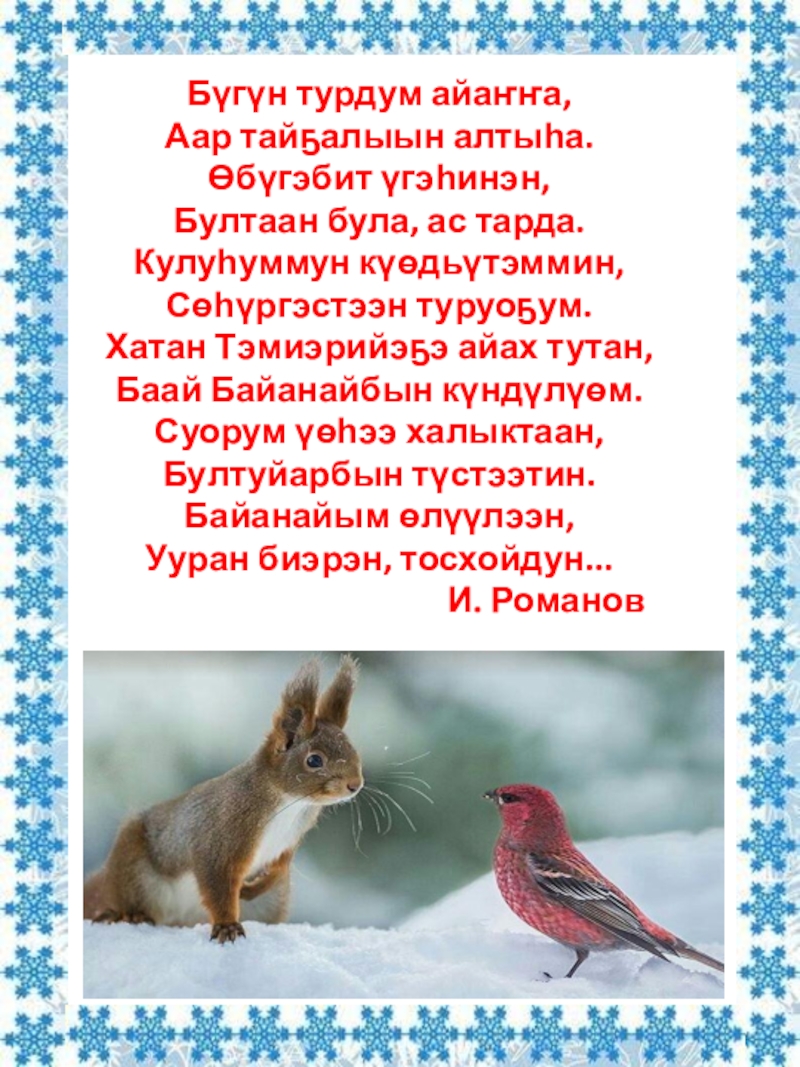 Сыала-соруга Ойуур хаһаайына Байанайы билиһиннэрии. Кини көтөрү-сүүрэри бас билэр, аһатар, көрөр-харайар. Байанайы ытыктыыр киһи үчүгэй булчут буоларын өйдөтүү.