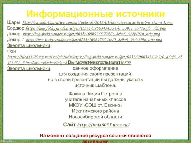 Информационные источникиШары http://nachalo4ka.ru/wp-content/uploads/2015/01/raznotsvetnyie-kruglyie-sharyi-1.pngБордюр https://img-fotki.yandex.ru/get/15541/39663434.754/0_a39ac_a54187f5_XL.pngДекор http://img-fotki.yandex.ru/get/9652/16969765.224/0_8ebe6_578f197b_orig.pngДекор 1 http://img-fotki.yandex.ru/get/6723/16969765.1fc/0_8c9a9_93de2f9b_orig.pngЗверята-школьникиФон https://filed15-26.my.mail.ru/pic?url=https://img-fotki.yandex.ru/get/6831/39663434.7e7/0_a6cf5_c2123d51_S.jpg&mw=&mh=&sig=852cf24472b23591d985d3ad7db72809 Зверята-школьникиНа момент создания ресурса ссылки являются активными