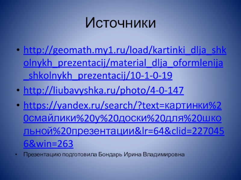 Источникиhttp://geomath.my1.ru/load/kartinki_dlja_shkolnykh_prezentacij/material_dlja_oformlenija_shkolnykh_prezentacij/10-1-0-19 http://liubavyshka.ru/photo/4-0-147 https://yandex.ru/search/?text=картинки%20смайлики%20у%20доски%20для%20школьной%20презентации&lr=64&clid=2270456&win=263 Презентацию подготовила Бондарь Ирина Владимировна