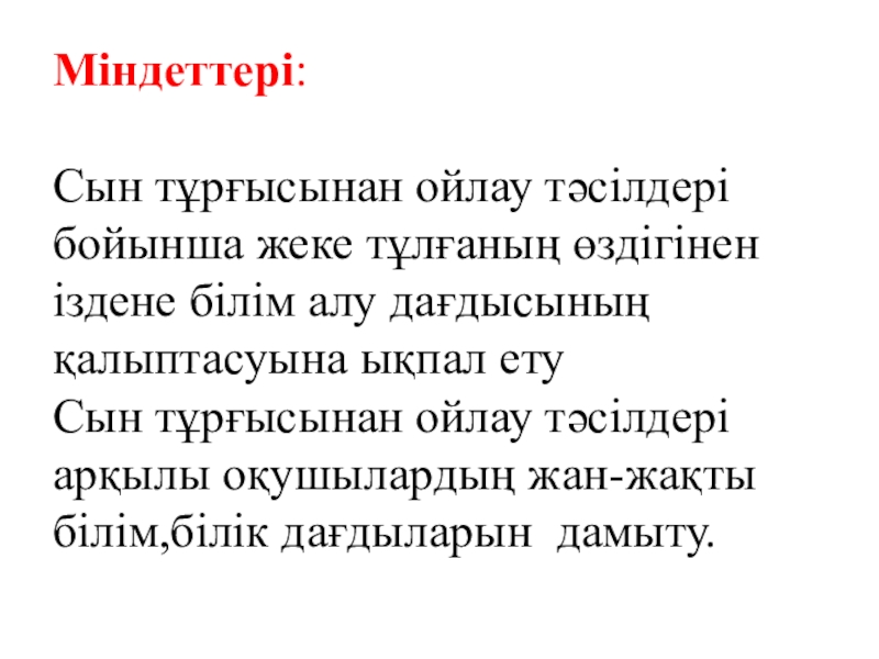 ОҚУШЫ ӨЗ БЕТІМЕН ЖӘНЕ БІРЛЕСІП ШЫҒАРМАШЫЛЫҚ ЖҰМЫС ЖАСАУ, ОЙ ҚОЗҒАЙ ОТЫРЫП , ОЙЫМЕН ӨЗГЕЛЕРДҢ ОЙЫНА СЫНИ ҚАРАП,ЕСТІГЕН БІЛГЕН БІЛІМІН ТАЛДАП,ТҰЖЫРЫМ ЖАСАУҒА БАҒЫТТАУ.
