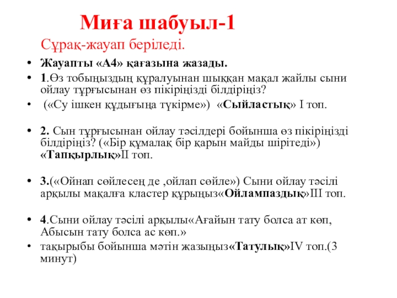 Тапсырмалар: Сұрақтар, ойластыру, зерттеу, қорғау,түйіндеу, т.б.