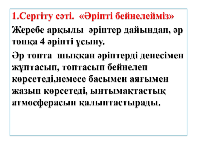 Әр топта шыққан әріптерді денесімен жұптасып, топтасып бейнелеп көрсетеді,немесе басымен аяғымен жазып көрсетеді, ынтымақтастық атмосферасын қалыптастырады.