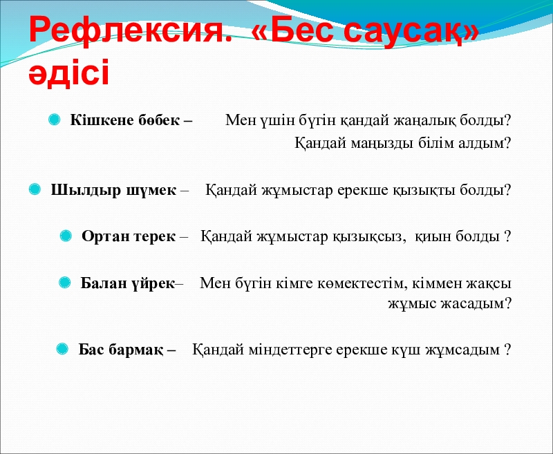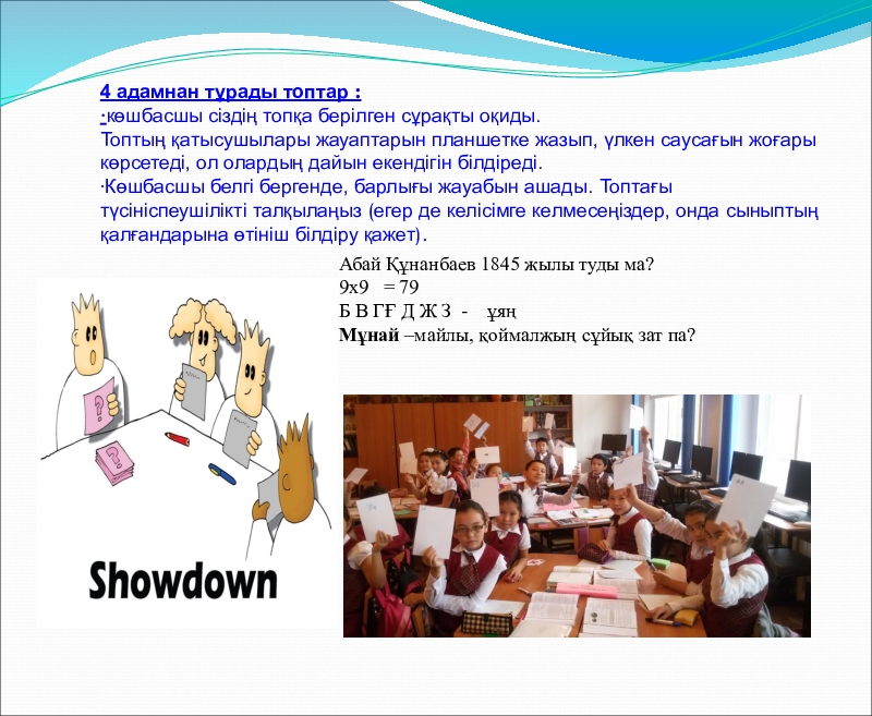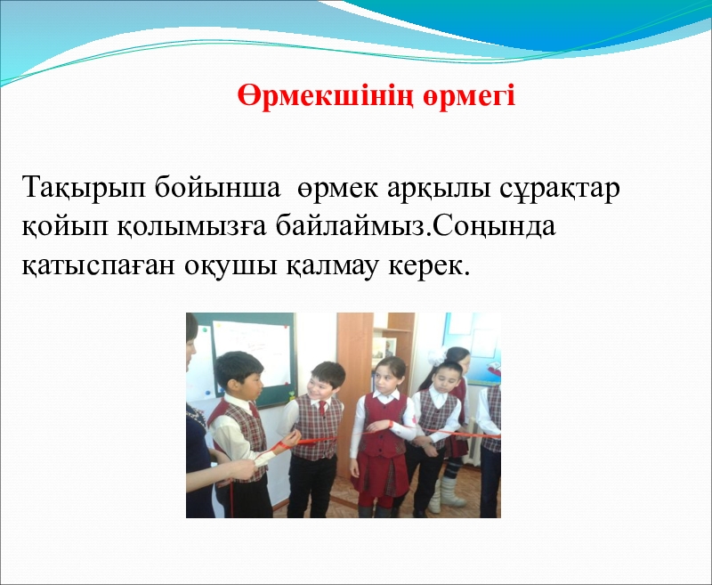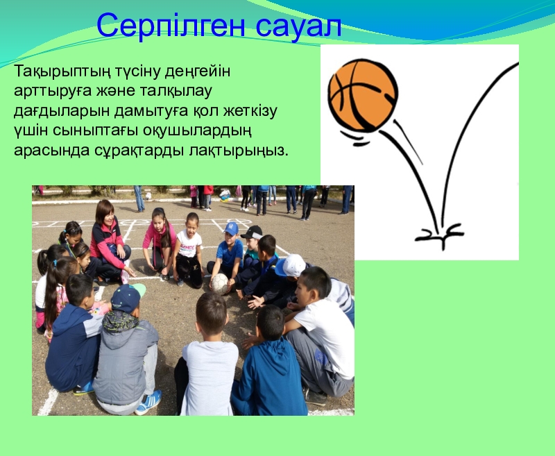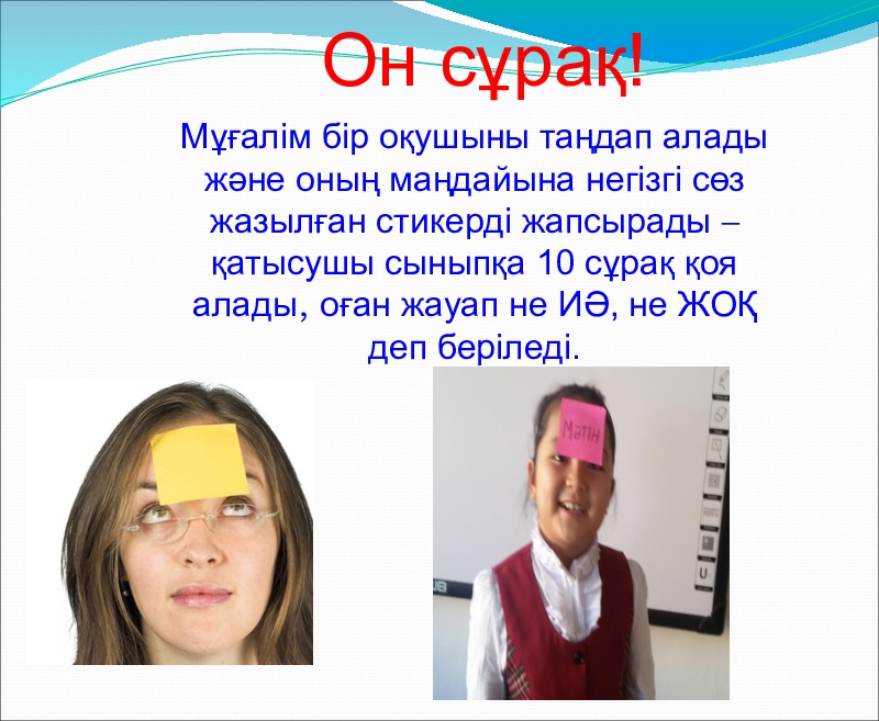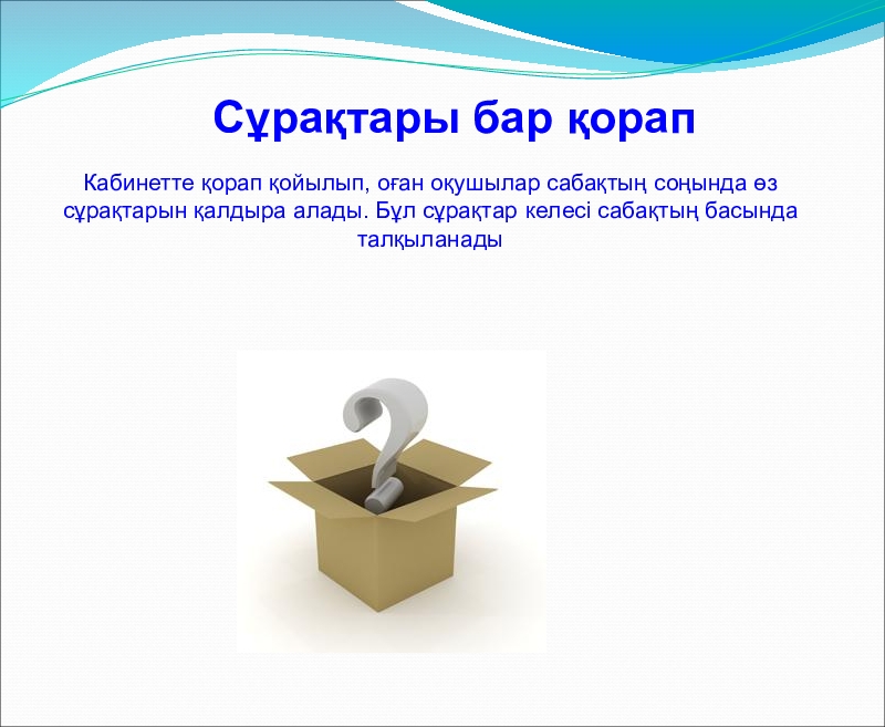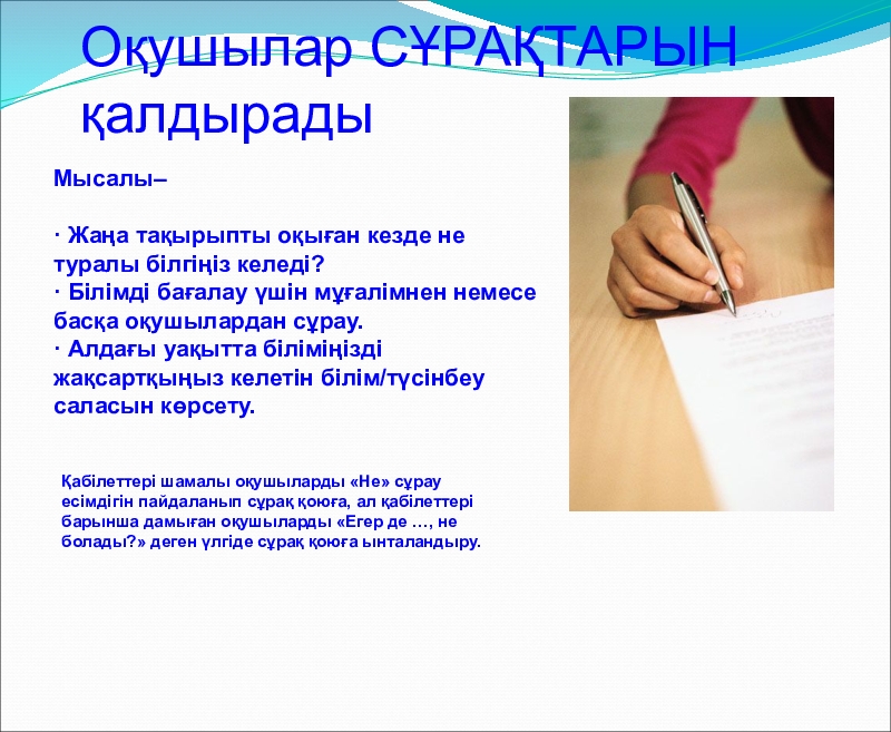 Қабілеттері шамалы оқушыларды «Не» сұрау есімдігін пайдаланып сұрақ қоюға, ал қабілеттері барынша дамыған оқушыларды «Егер де …, не болады?» деген үлгіде сұрақ қоюға ынталандыру.