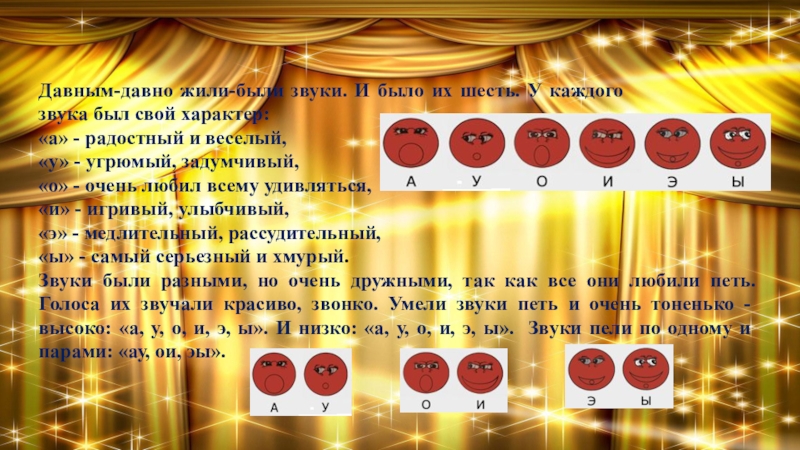 Звуки были разными, но очень дружными, так как все они любили петь. Голоса их звучали красиво, звонко. Умели звуки петь и очень тоненько - высоко: «а, у, о, и, э, ы». И низко: «а, у, о, и, э, ы». Звуки пели по одному и парами: «ау, ои, эы».
