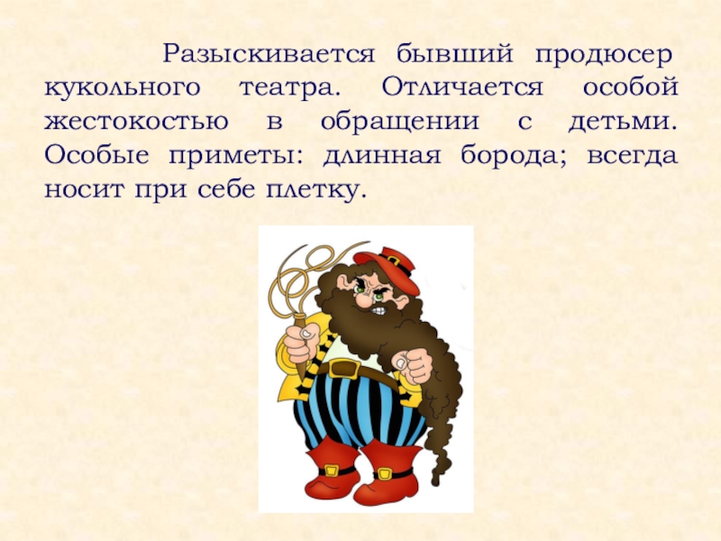 Слайд 5 Разыскивается бывший продюсер кукольного театра. Отличается особой жестокостью