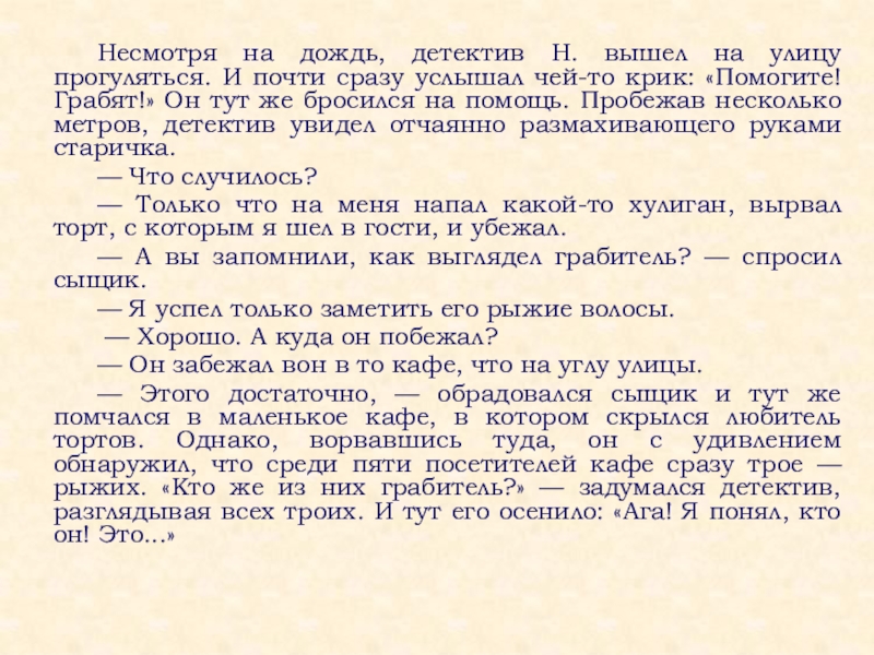 — Этого достаточно, — обрадовался сыщик и тут же помчался в маленькое кафе, в котором скрылся любитель тортов. Однако, ворвавшись туда, он с удивлением обнаружил, что среди пяти посетителей кафе сразу трое — рыжих. «Кто же из них грабитель?» — задумался детектив, разглядывая всех троих. И тут его осенило: «Ага! Я понял, кто он! Это...»