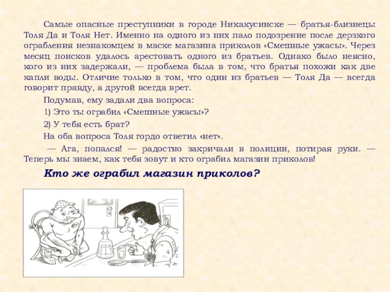 Толя Нет. Именно на одного из них пало подозрение после дерзкого ограбления незнакомцем в маске магазина приколов «Смешные ужасы». Через месяц поисков удалось арестовать одного из братьев. Однако было неясно, кого из них задержали, — проблема была в том, что братья похожи как две капли воды. Отличие только в том, что один из братьев — Толя Да — всегда говорит правду, а другой всегда врет.