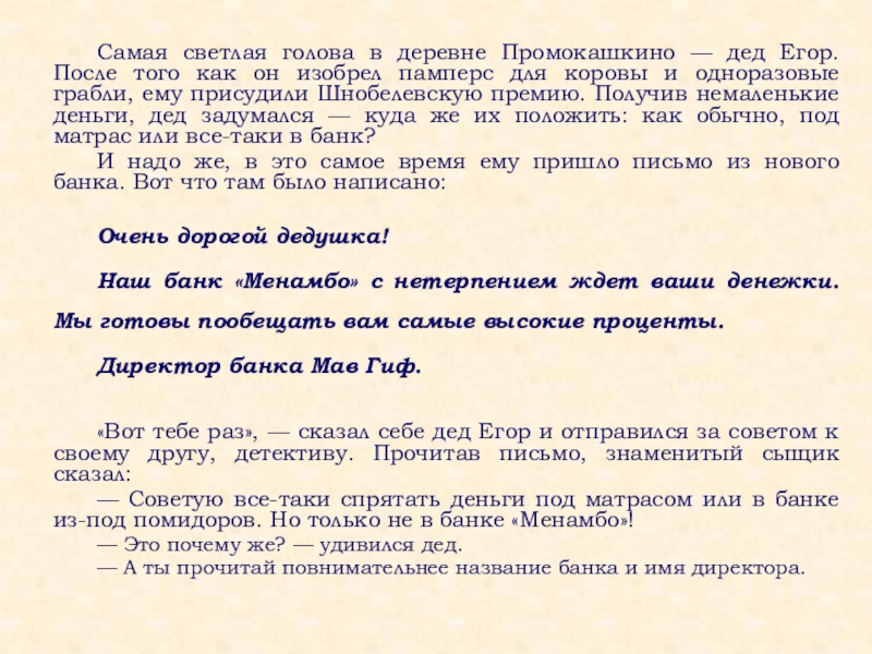 «Вот тебе раз», — сказал себе дед Егор и отправился за советом к своему другу, детективу. Прочитав письмо, знаменитый сыщик сказал: