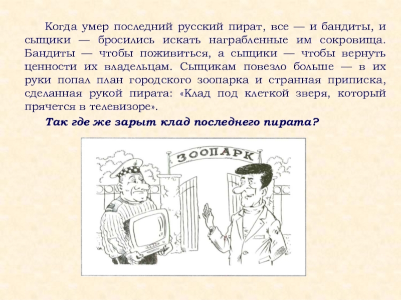 — бросились искать награбленные им сокровища. Бандиты — чтобы поживиться, а сыщики — чтобы вернуть ценности их владельцам. Сыщикам повезло больше — в их руки попал план городского зоопарка и странная приписка, сделанная рукой пирата: «Клад под клеткой зверя, который прячется в телевизоре».