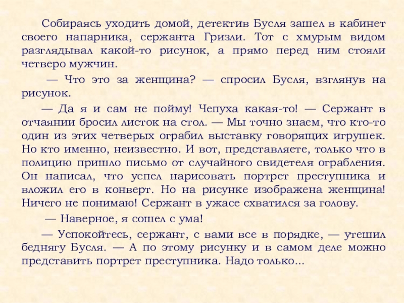 Слайд 22Собираясь уходить домой, детектив Бусля зашел в кабинет своего напарника, сержанта