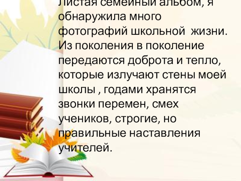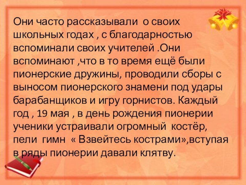 Они часто рассказывали о своих школьных годах , с благодарностью вспоминали своих учителей .Они вспоминают ,что в то время ещё были пионерские дружины, проводили сборы с выносом пионерского знамени под удары барабанщиков и игру горнистов. Каждый год , 19 мая , в день рождения пионерии ученики устраивали огромный костёр, пели гимн « Взвейтесь кострами»,вступая в ряды пионерии давали клятву.