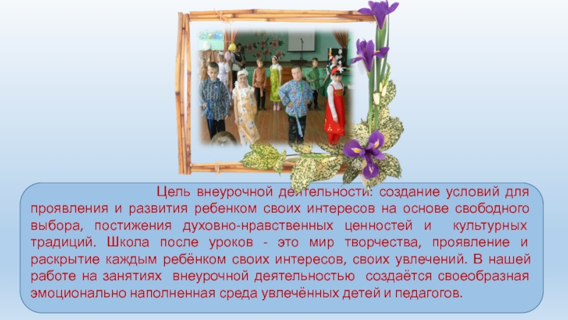 Цель внеурочной деятельности: создание условий для проявления и развития ребенком своих интересов на основе свободного выбора, постижения духовно-нравственных ценностей и культурных традиций. Школа после уроков - это мир творчества, проявление и раскрытие каждым ребёнком своих интересов, своих увлечений. В нашей работе на занятиях внеурочной деятельностью создаётся своеобразная эмоционально наполненная среда увлечённых детей и педагогов.